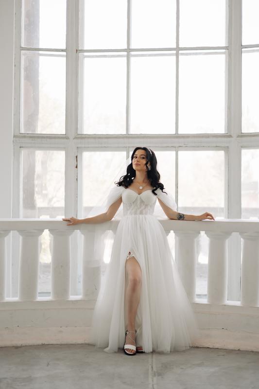 Розмір 42-44 Корсет регулюється Ріст 165 см Гарно підкреслює декольте Без підьюбника На правій нозі розріз Брала в розмарині за 20000 Чохол та вішалка в комплекті Відео можу скинути Колір молочний Після хімчистки !!!