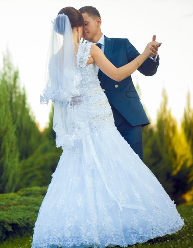 Шикарна весільна сукня для тендітної нареченої фасон русалка. Розмір 42-44 укр, мій ріст 1'65+каблуки 10см. Колір білий. Пояс з камінчиками,низ плаття обшите круживом. Куплена в салоні.