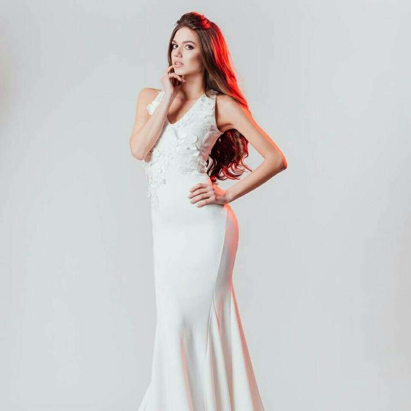 Вишукана біла сукня зі шлейфом. Тканина креп-дайвінг, стрейчева. Вишита квітами 3D та прикрашена камінням Swarovski.