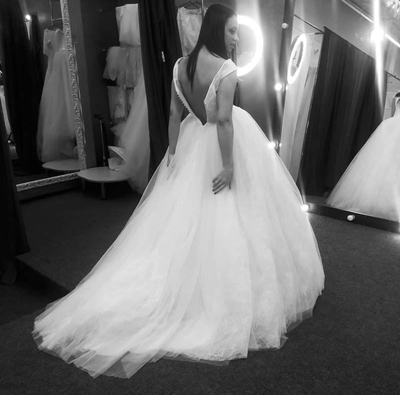 Дизайнерська сукня 2019року. Сукня була зшита на наречену з параметрами 90 70 100 зі зростом 169см. Сукня зшита з оригінальною спинко, регулюється шовковою стрічкою. На бюсті підшитий пушап, якщо хто має більші груди, пушап можна зняти. Юбка зшита з 9 слоів з фатину передостанній слой Фатіна з оригінальною вишивкою. Круги на фото купувались окремо, на фото сукня з кругами номер 9. Кому подобається менш пишніші сукні на вибір купуєте менші круги. Зад сукні зі шлейфом.