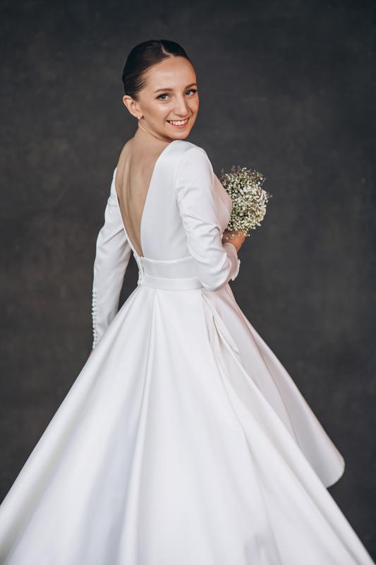 Тканина - Атлас Плаття в ідеальному стані, так як була в ньому лише на фотосесії в студії, в церкві та на святковій вечері з рідними. Розмір: • Об'єм грудей - 83 • Об'єм під грудьми - 73 • Розмір білизни 75В • Об'єм талії - 67 • Об'єм стегон - 86 • Ріст, яка висота каблука планується - 156, 5-6 см • Довжина рукава від кісточки на плечі до кісточки на зап'ясті - 55 • Довжина від плеча до талії через центр грудей - 43 • Довжина від плеча до талії по спинці - 39 Плаття сідає ідеально по фігурі навіть, якщо є відхилення від параметрів 10-15%