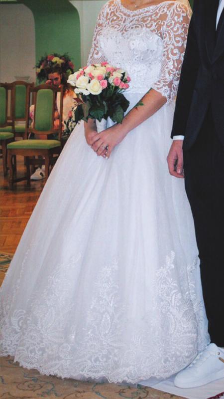 Шикарное свадебное платье А - силуэт платья Стан 9/10 После химчистки Платье состоит из 8 юбок>Плот атласная, сетка, атласная, 4 юбки фатиновых и самая главная юбка фатин с вышивкой и бисером внизу atch В корсети также есть вышивка с бисером + рукава до локтя все нежной вышивкой и бисером В подарок к платью есть подъюбник на 3 кольца Размер 46atch но платья расшивали при покупке и вставляли вставку при замке UN ОГ 97/ ПРО 88 Купила за 8500 Продаю при 5500 Возможный тор Анна моб. ****** Киев В личные сообщения могу рассказать все подробно и отправить доп.фото Дополнительно к платью продаю плюшевую белую шубку - 700 грнamp покупалась за 1200 изна