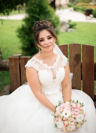 Свадебное платье в идеале, без каких-либо повреждений.Не венчанное. Размер 44-46 регулируется корсетом. Рост 160+ каблук 10 см. В подарок отдам подъюбник на 5 кольца.