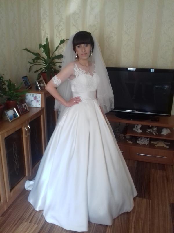 Платье очень красивое, прекрасное качество. Юбка - королевский атлас, небольшой длины шлейф, который сзади аккуратно пристегивается.Также есть карманы, что очень удобно. Верх выглядит очень нежно; Цвет айвори, корсет застегивается на молнию и затягивается. Хорошо подчеркивает талию. Платье одевалось один раз, в идеальном состоянии
