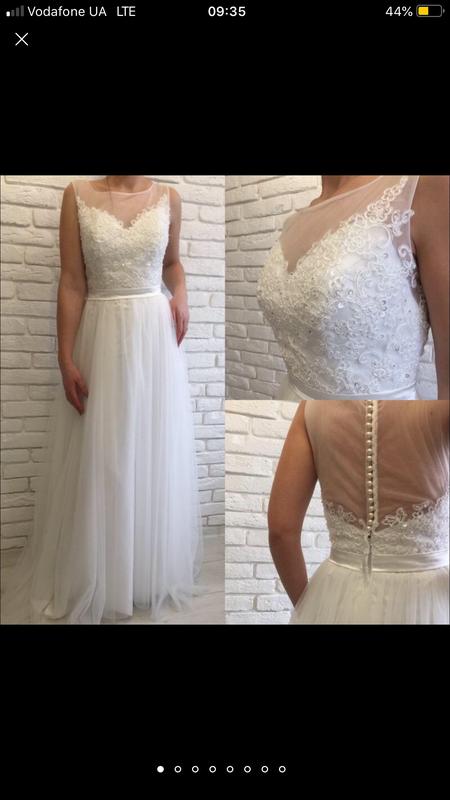 Розмір S/M. Ефектна весільна модель, ніжного спадаючого силуету. Верхня частина сукні - сітка, оздоблена трендовим мереживом, в ручну- розшитим дрібними паєтка і бісером. Ззаду застібається, на блискавку, поверх якої білі перламутрові ґудзики, які придають платтю - вишуканості і неймовірної ніжності. Основа спідниці з атласу, поверх якої 2 слої євросітки та доповнена шлейфом. Сукня яскраво-білого кольору. Лінія талії прикрашена - витонченим атласом. За потреби надам більше фото і розмірів!