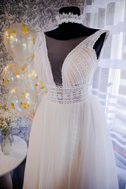 Прекрасна весільна сукня в стилі бохо. Сукня бренду ROKSANA wedding. А-силует сукні. Сукня в ідеальному стані, після хімчистки. Низ сукні фатин з вставками мережива, верх сукні мереживо з сіточкою. Присутній шлейф. Вставлений пушап, виймається. Сукня зручна і не важка. Спинка відкрита, за рахунок цього непарило навіть у жаркий день. Розмір S. Зріст 165 + 8 см підбори.