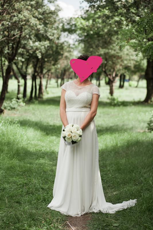 Свадебное платье, очень нежного молочного цвета. Удлинённый "хвост", расшито жемчугом. Сзади спинка на пуговках. Состояние идеальное.
