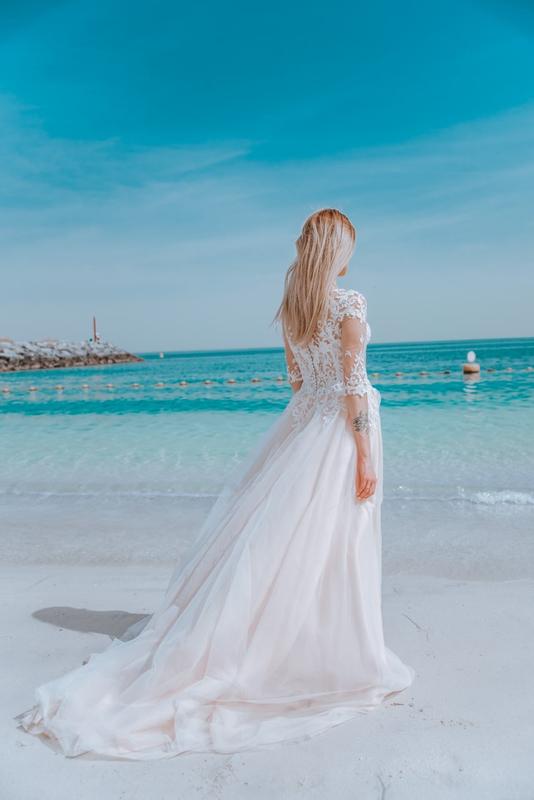 Купувалося в салоні Княжна, одягалось на фотосесію. Дуже красиве і ніжне плаття, легкого кремового кольору, шикарно виглядає на фото;) Сукня після недешевої хімчистки. На фото дівчина зріст 168, 91/71/91. В подарунок коло 1-ка (спідниця) та чохол.