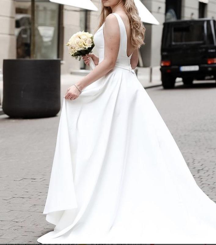 Лаконичное платье, покупалось в свадебном салоне, из плотной ткани, держит форму, с чашками и в пыльнике. Размер М(38). Могу скинуть больше фото, пишите.