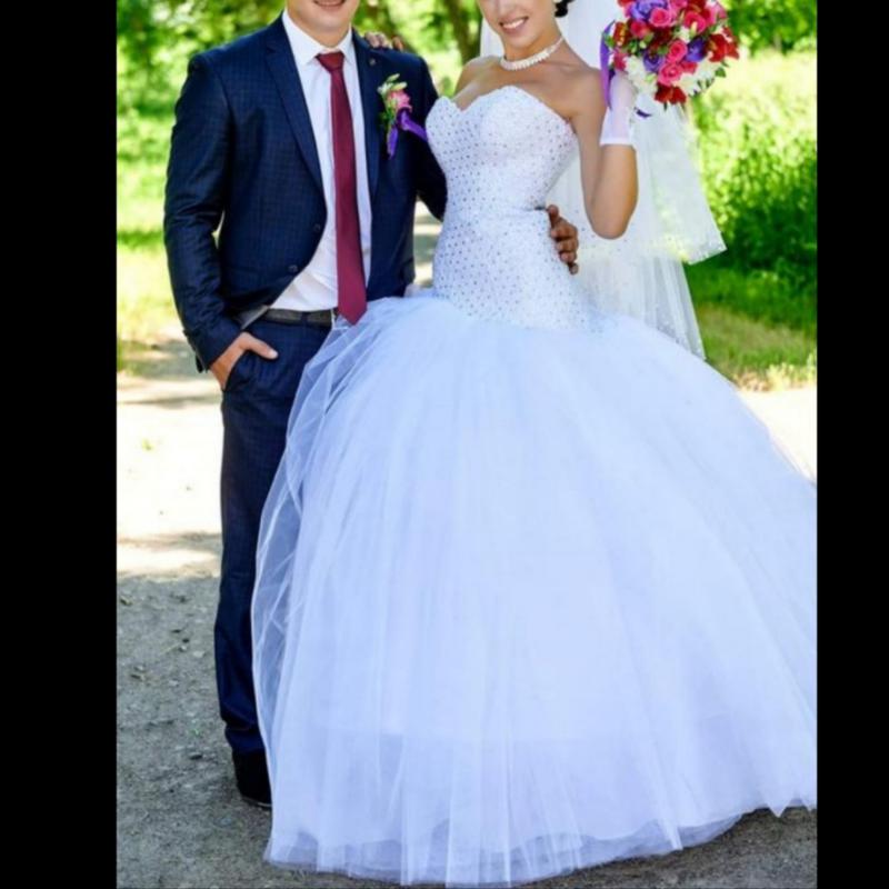 Пышное белоснежное свадебное платье в идеальном состоянии,корсет в камнях и жемчуге,на спине молния и шнуровка. В комплекте отдам кольца под платье, перчатки и фату. Размер 42-46 Подойдёт для роста 158-175(в зависости от высоты каблука) больше фото вышлю в личку.