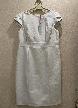 Платье белого цвета. Фактурная с добавлением люрексов пищи.. Абсолютно нова. Прямой крой. Короткий двухслойный рукав. Очень милая и нежная. Размер 52. Длина 97 см. Полуобхват груди 46 см. Цена 400 грн.