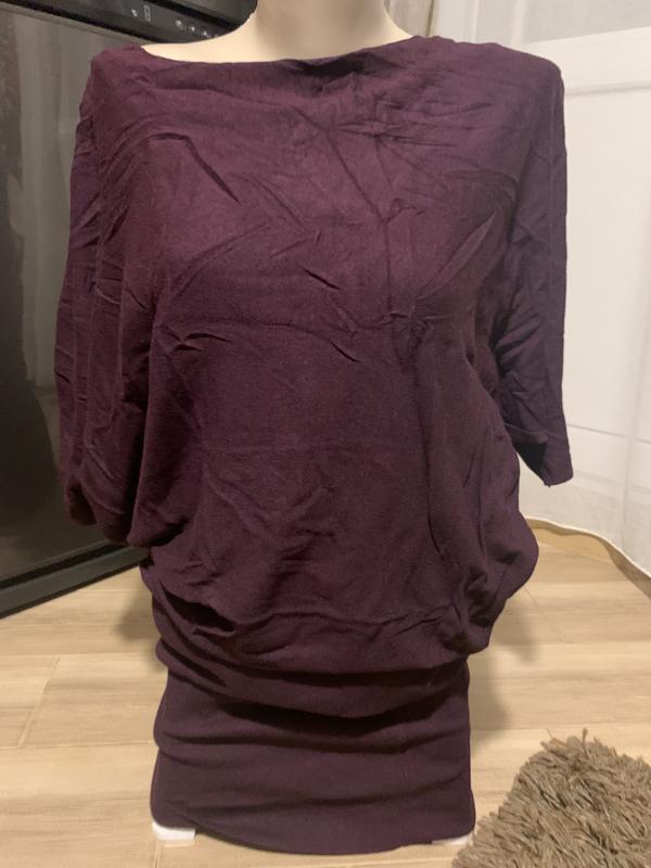 Очень красивый баклажановый цвет, превосходное качество , низ- стейчевый, на подкладке, тянется, очень подчеркивает фигуру, а за счёт верхней балахонистому срывает погрешности в фигуре, трансформируется на фигуре