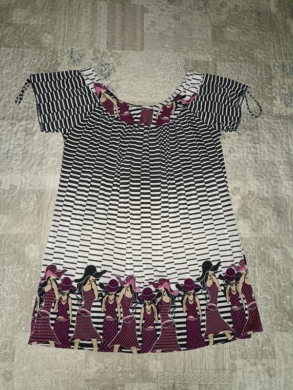 блуза трикотажная удлиненная с коротким рукавом "девушки в шляпках", хорошо растягивается, черный, белый, бордо, беж размер 7, грудь 60см, стегна 62см, длина рукава 14см, длина 75