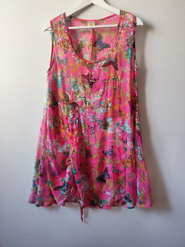 В цену входит оплата сайту . Состояние идеальное, новая , дефектов нет. Ткань тонкая шиыон. Прозрачная . Размер смотрите по меркам пог 52 см пот 54 см по низа 74 см длина 90см