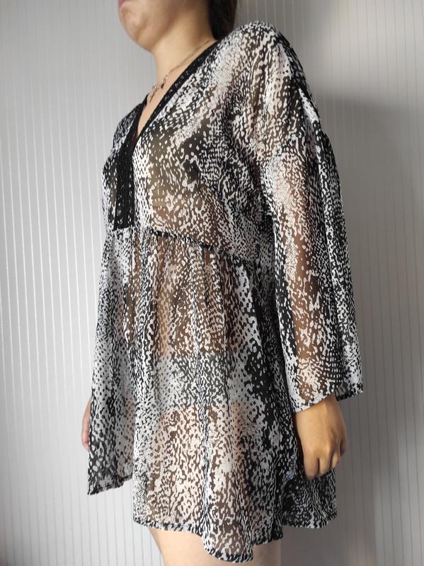 Шифоновая полупрозрачная пляжная туника с вышивкой спереди в змеиный принт. Размер 16, наш 52-54. Длина 84, длина рукава 34, плечи 65, ПОГ 56, ПИТ 52, низ до 85 см. Стан идеален!