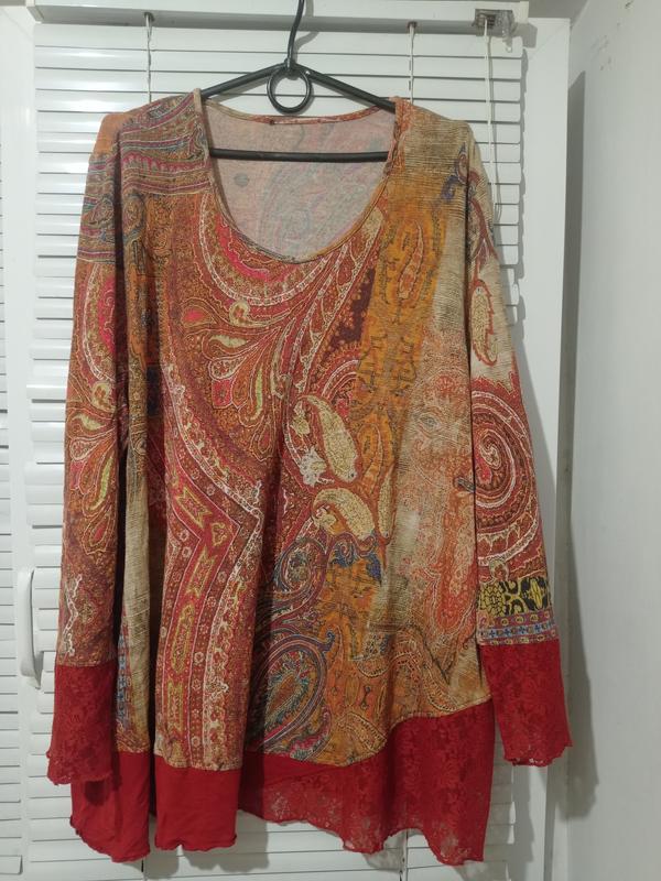 Красивая туника очень мягкая, отлично тянется нажаль бирки срезано. Рукав и по низу асимметрично украшен кружевом, цвет кружева темно оранжевый, не красный, как на фото, замеры в спокойном состоянии ПОГ 68, ПОБ 80, длина 70