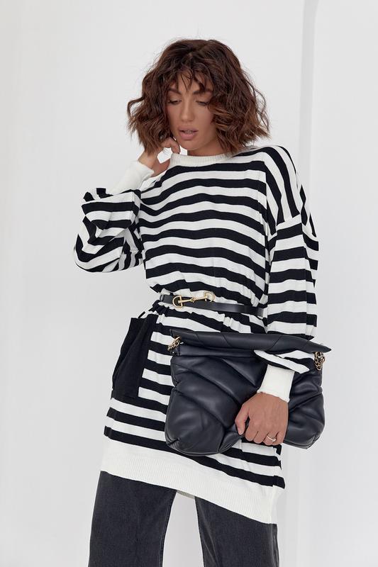 Эта модель в стиле оверсайз полностью украшена полоской, а внизу дополнена однотонным карманом. Длинные рукава заканчиваются тугом манжетом. Проймы опущены. По низу изделия также присутствует манжет с тонкой резинкой по краю. Короткий однотонный воротник-стойка на круглой горловине. Страна Турция Материал Вязка Состав ткани 50% акрил, 50% котон Параметры модели 84*60*92 рост 173 Универсальность Замеры одинаковы для всех размеров - особенность фасона модели Размер на фото one siz Длина переда изделия, см 86см Длина рукава от горловины, см 80см Ширина под проймами рукавов (над грудью), см 64см Длина рукава по внутреннему шву, см 50см Ширина по стегнам 64с