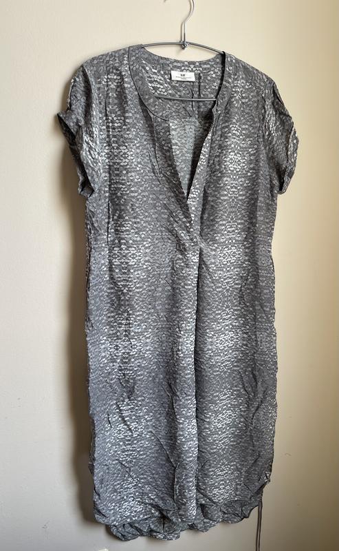 Шелковая дизайнерская туника бренда Day Birger Et Mikkelsen Дания. Состав: 70% шелк, 30% вискоза. Размер 38, М. Идеальное состояние, плотный шелк, на талии тонкий поясок. Цвет серый.