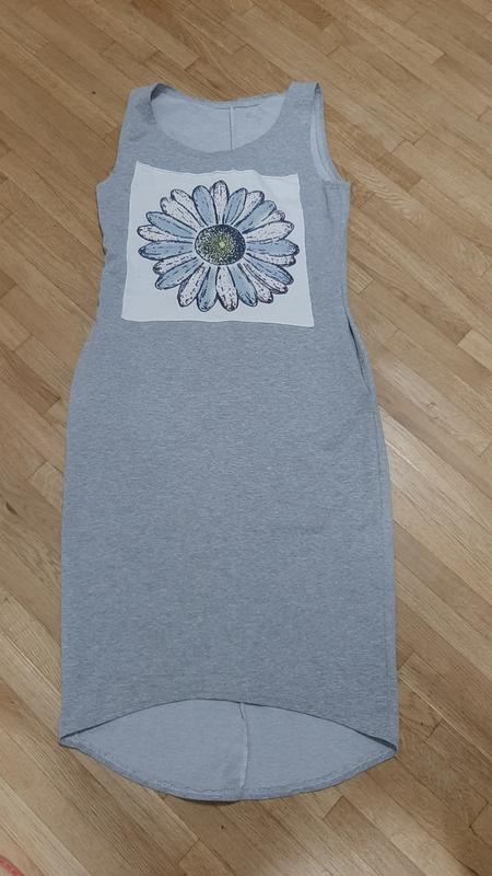 Платье туника ниже колена зад длиннее есть карманы, спереди узор, коттон