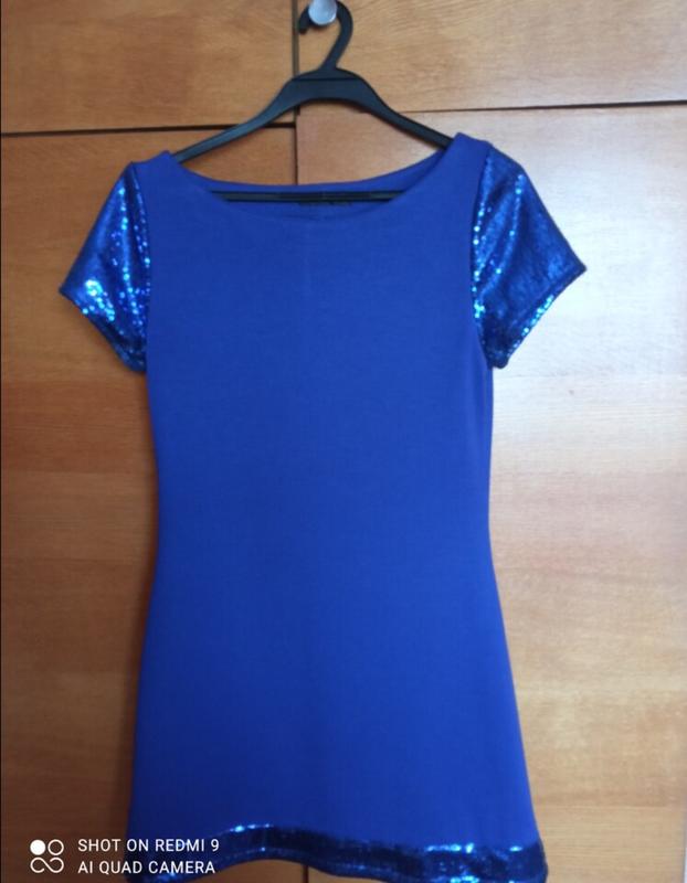 Стан б/в Розмір 40 Made in Turkey ПОГ 42 см ПОТ 39 см ПОБ 40 см Пройма 22 см Довжина плаття 77 см Плаття оздоблене блискучими синіми паєтками на рукавах