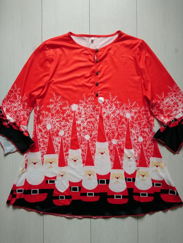 Новогодняя туника в очень хорошем состоянии Материал полиэстр, эластичный Размер 2XL Длина 75 см В плечах 39 Под руками 52 см и тянется до 76 Рукав от плеча 44