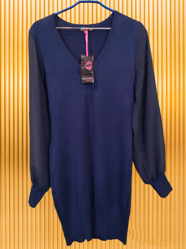 Темно-синее трикотажное платье туника с полупрозрачными шифоновыми рукавами. V-образный вырез. Новая и качественная. Произведена в Германии, бренд Melrose. Хороший состав: 70% вискоза. Хорошо подчеркивает фигуру. Must have в гардеробе для всех стройняшек, компанируется со многими вещами P.S Подписывайтесь на мою страницу, где я предлагаю товары хорошего качества по приятным ценам. Разбираю гардероб, поэтому будут регулярные обновления позиций