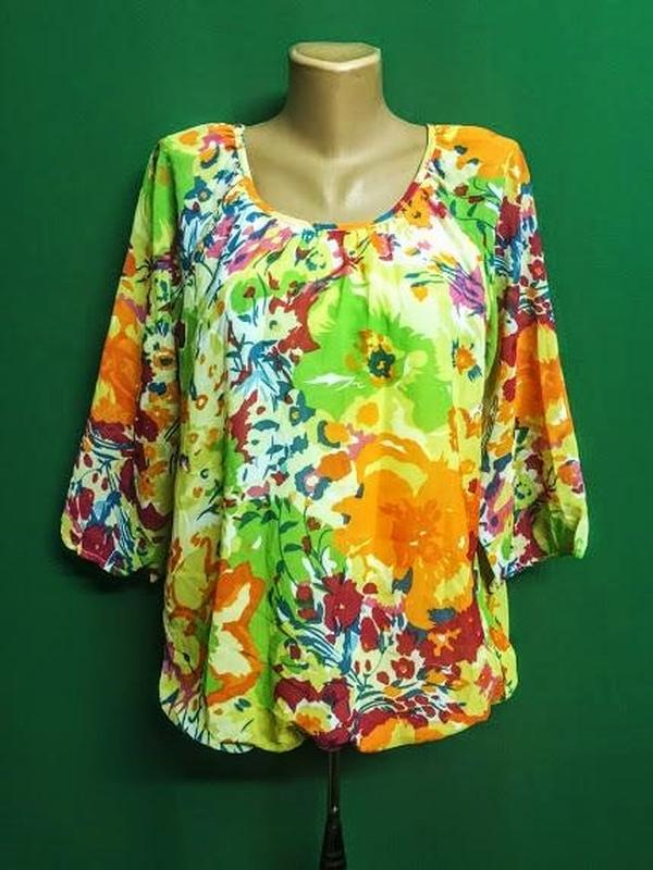 Яркая Туника Liv - 100% Полиэстер (шифон) с подкладкой Указан евро размер 38, по меркам на наш 46-48 Реглан Пройм 22 см В груди 48-52 см В талии (в подкладке) 48 см В бедрах на резинке 47-54 см Длина рукава от горловины 51 см Длина спинки 57 см Идеальное состояние Торгу нет
