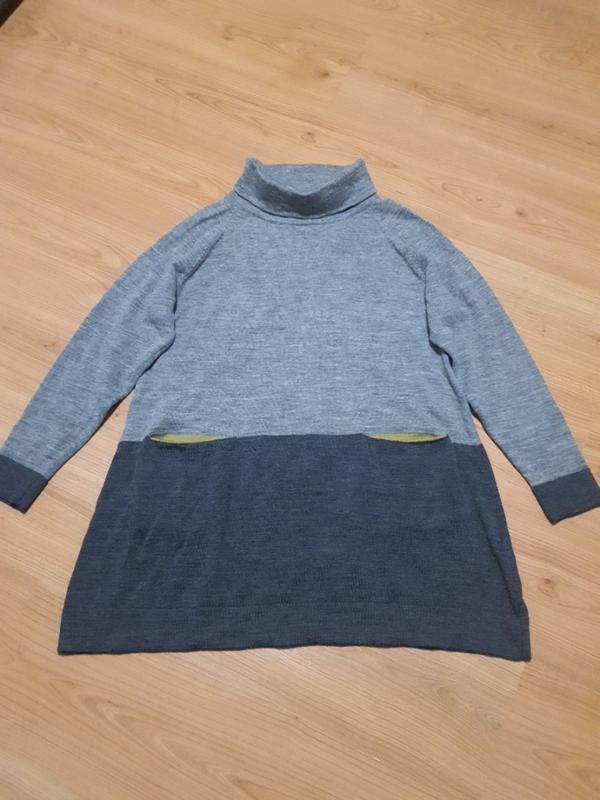 Туніка- плаття із 100% вовни тепле і м'якеньке, можна носити з лосинами і штанами. Спереді два кармани , всередині жовтого кольору, верх світло сіра вовна, низ темно сірий. Стан ідеальний. Заміри: шпог-51, шпоб-61, довжина-75, довжина рукава від горловини-63.