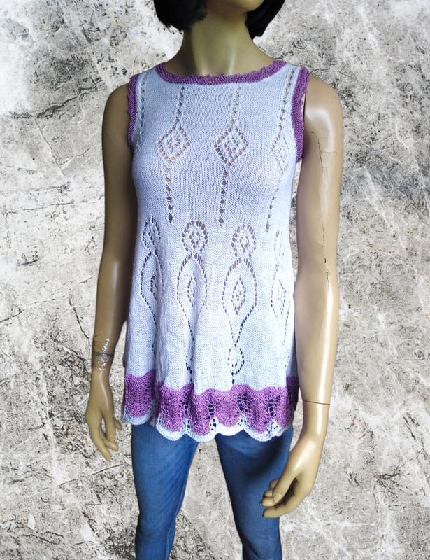 Летняя туника с контрастным сиреневым кружевом, связана из мягкой полухлопка. Отлично смотрится с джинсами, шортами, юбочками. Размер 42-44 Ручная работа
