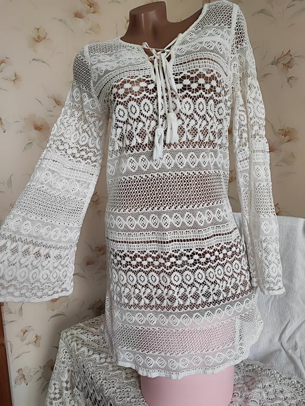 Шикарное пляжное платье- туника белого цвета. Натуральная качественная кружевная плотная ткань, тянется. ПОГ-ПОТ-ПОБ 46-44-50 см. Тянется +- 4 см. В плечах 38 см. Широкий расклешенный рукав. Длина рукава от плеча 64 см. Глубокий вырез декольте на шнуровке. Состояние новой вещи. Дефектов нет.