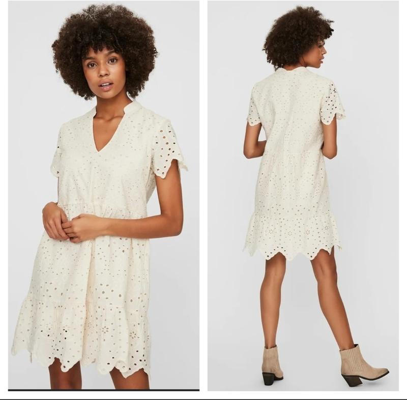 Летнее платье-туника очень красивое, стильное, новое без бирки, Кремовое кружевное платье Vero Moda, размер M Тканина: 100% бавовна Состояние новое, без бирки. Размер M, прибл. измерение (взято плоско): - Объем груди: 50 см (от подплечья до подплечья) - Длина: 90 см