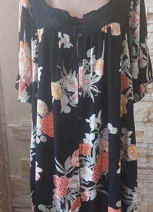 Туника (можно как летний халатик) Большого размера.Нова, с бумажной биркой, приятная к телу.Не парит, не жаркая натуральная ткань,крой свободный, 100% вискоза. На гудзиках.з красивим натуральним кружевом Дли от плеча 87см пог.80 полуширина внизу 99см