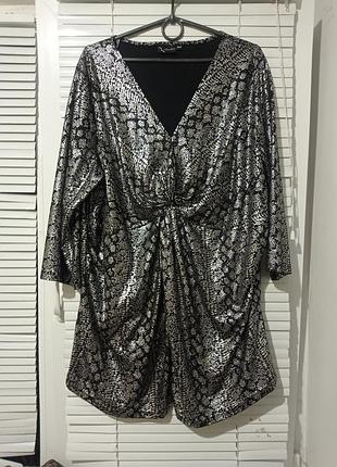 Чрезвычайно красивая, нарядная туника, трикотаж тоненький, как футболочница, мягкий, серебристый принт красиво сверкает, драпировка спереди скрывает все особенности пышной фигуры, отлично тянется ПОГ 70, ПОБ 72, длина 82