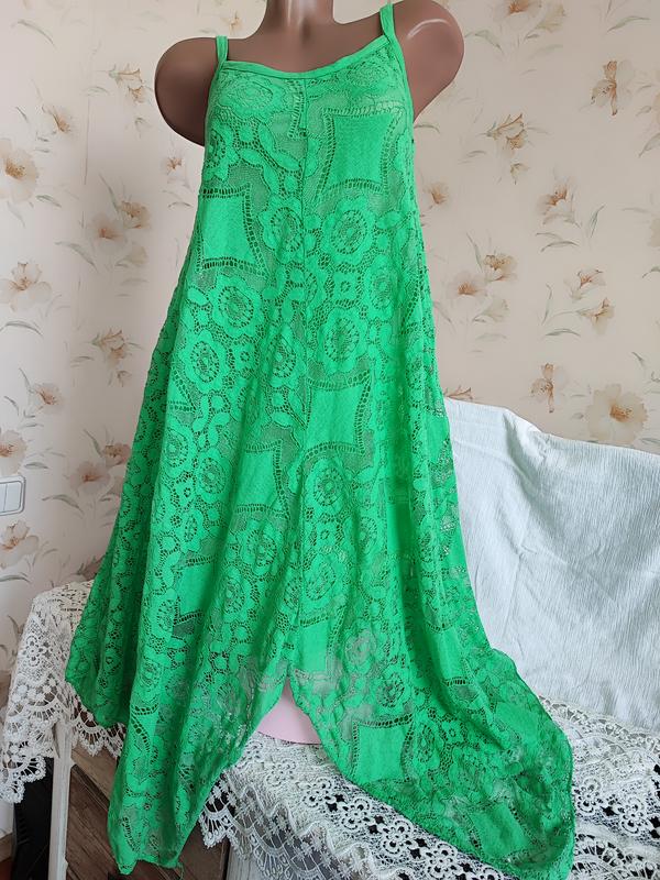 Шикарное оригинальное асимметричное платье-туника яркого салатового цвета с нижней майкой. Открытые плечи. Нижнее платье 82 см, тянется. Размер от 46 до 52 укр. Ткань качественная , приятная к телу . Смотрится очень эффектно и стильно. Состояние новой вещи. Следы ношения отсутствуют. Дефектов нет.