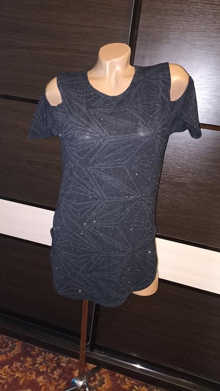 Нарядная туничка на стройную красотку. Плечики открыты. Отлично тянется. Присутствует легкий блеск. По бокам разрезы Спинка немного длиннее. ОГ 92-116 см ОТ 88-114 см ОБ 92-122 см Длина 71-81 см