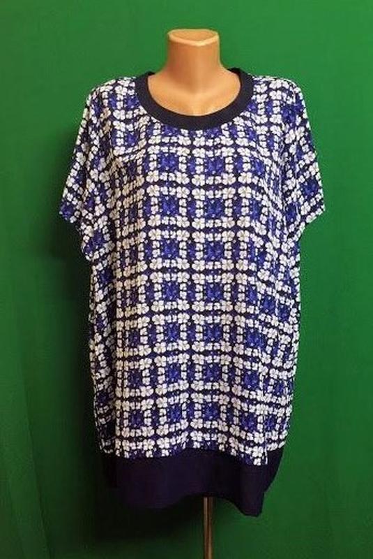Туника Yessica (Германия) - Полиэстер весомая ткань, абсолютно не просвечивается, держит форму Горловина трикотаж синего цвета Евро размер XL, по меркам на наш 54-56 Ширина у плечах 44 см Пройма 30 см (бицепс 26,5 см) В груди 68 см У таліі 68 см В стегнах 70 см Длина спинки 76 см Новая (в упаковке) Торгу нет
