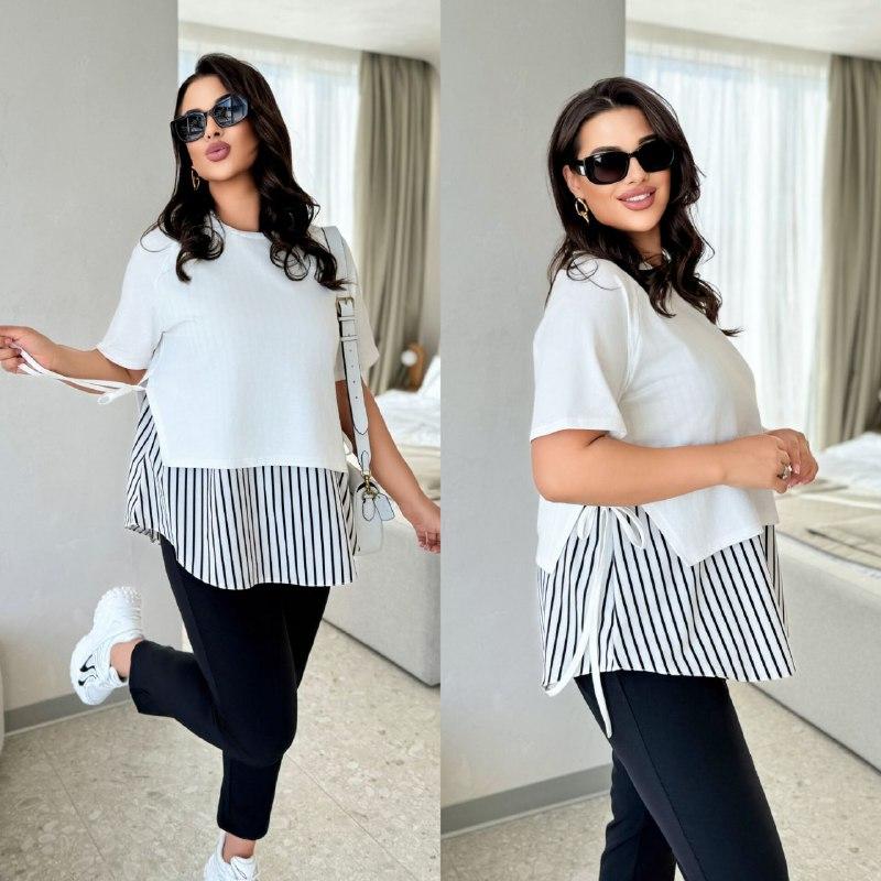 Розмір: 48-52, 54-58, 60-64 Тканина: турецький кулір + софт Колір: молоко, чорний Туніка подовжена, вільного крою, імітація двійки. Дорога, якісна тканина, не парить. Виміри: 48-52 Груди 114 см Стегна 140 см Довжина виробу 72 см 54-58 Груди 122 см Стегна 150 см Довжина виробу 76 см 60-64 Груди 136 см Стегна 160 см Довжина виробу 80 см На моделі вдягнутий розмір 48-52 окс