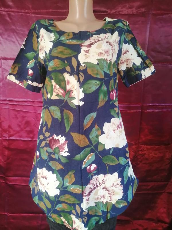 Интересная женская туника. Цветочный принт. Дно округлое. Размеры: длина изделия 80 см, плечи 40 см, обхват груди 50,5 см, обхват бедер 53 см, низ 60 см, длина рукава 24 см, внутренний шов 11,5 см.