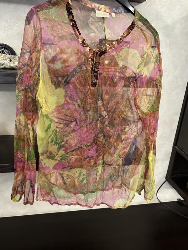 Туника прозрачная с цветочным орнаментом, украшена пайетками. Подмышками дефекты по швам.