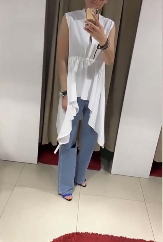 Туника, безложений, состояние новой, подмышками полуобхват 48, длина по спинке 98, длина впереди 60, по бокам еще есть длинные углы, размер указан 40 но по факту на S-L