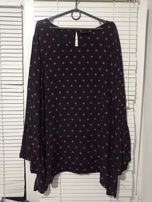 Очень красивая, оригинальная туника, тоненькая, не тянется, едва просвечивает. Бирки с размером и составом ткани срезаны. Свободного, летающего силуэта - трапеция по бокам небольшие разрезы. ПОГ 72, ПОБ 85 длина 78