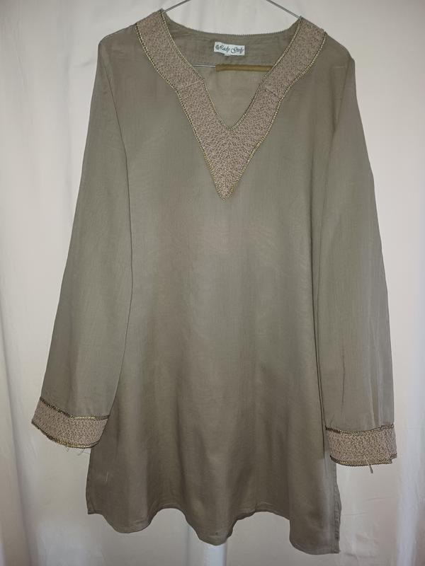 женская легкая туника. Замеры длина изделия по середине спинки 83 ширина виробу по плечах 40 длина рукава от плеча 63, ширина рукава по низу 16 пог49 по боковым швам имеются распорки длиной 24. Горловина и рукава отделаны котоновой отделкой. Ответим на все ваши вопросы, сложи доп. замеры и фото Возвращение нет Доставка: 100%-на подписку на карту.З "Безпечной оплатой" не работающая Отправка в течение 1-2 рабочих дней после получения оплаты заказ Укрпочтта, Новая Почта на Ваш выбор.