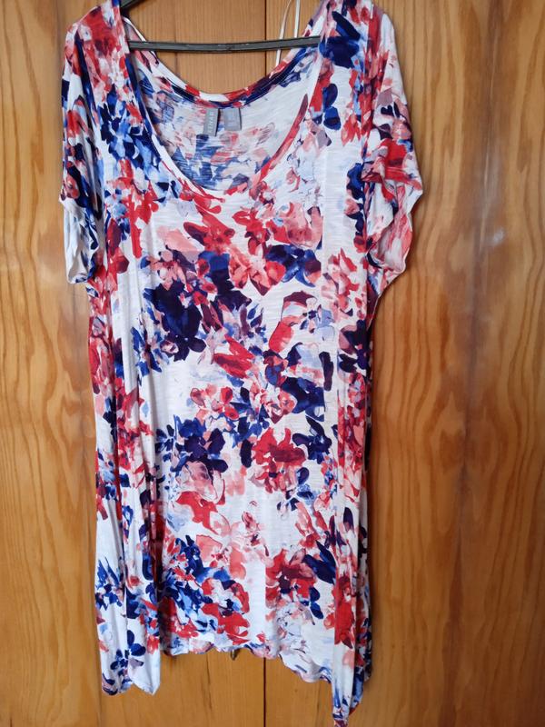 Очень красивая туника, нежная, приятная ткань - хлопок. Внизу расширена и удлиненные клинья по бокам. Состояние отлично.Размер 54-56.