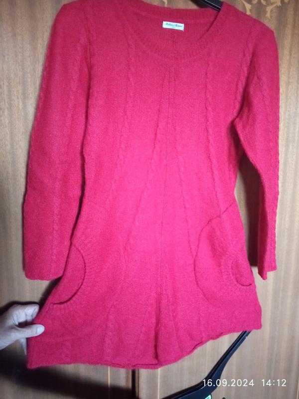 Малиновый цвет, не такой яркий как на фото, полуобхват груди 47см, полуобхват бедер 50см, длина рукава 56см, длина туники-82см,60% мохер,20%шерсть,20% нейлон