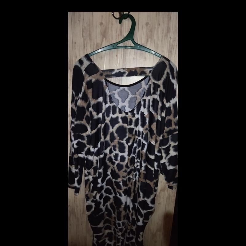 Классное фирменное платье большого размера с интересным вырезом на спине.Принт леопард.Приемное на ощупь,легкая.Гарно тянется.Замеры в спокойном состоянии полуобхват груди78,внизу заужина полуобхват 56,рукав треть, длина 107.Песилой