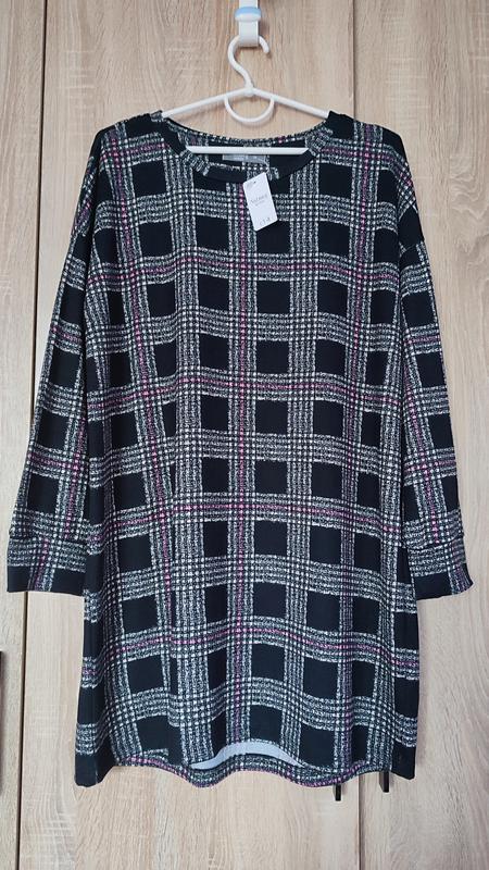 Хорошенькая новая туника. Цвет черный в белую и розовую полоску, образующую клетку. Мягкий, теплый, фирменный и качественный. Замеры: ПОГ и ПОС 60 длина 84 Производитель Камбоджа