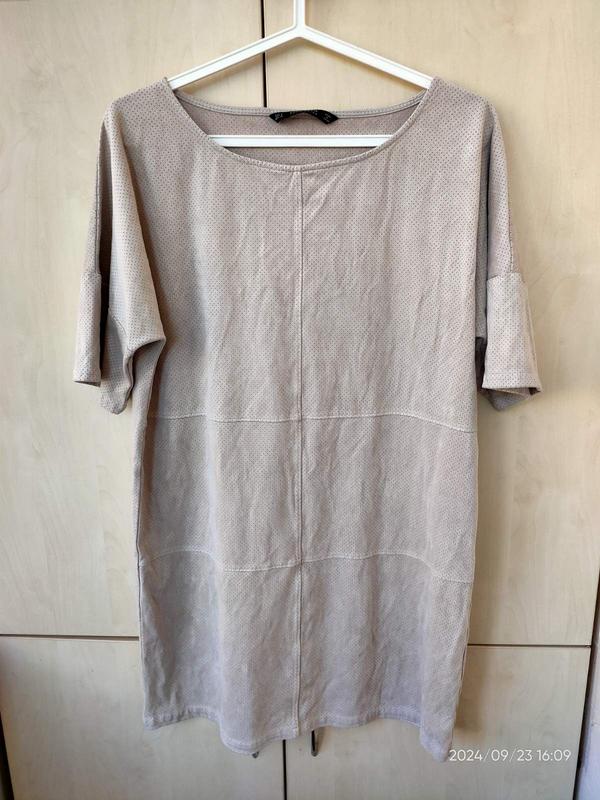 Туника Zara р-р S под замшу. Замеры: полуобхват груди 51, полуобхват талии 51, полуобхват бедер 52, длинна 78. В хорошем состоянии, без дефектов. Цвет серо-бежевый.