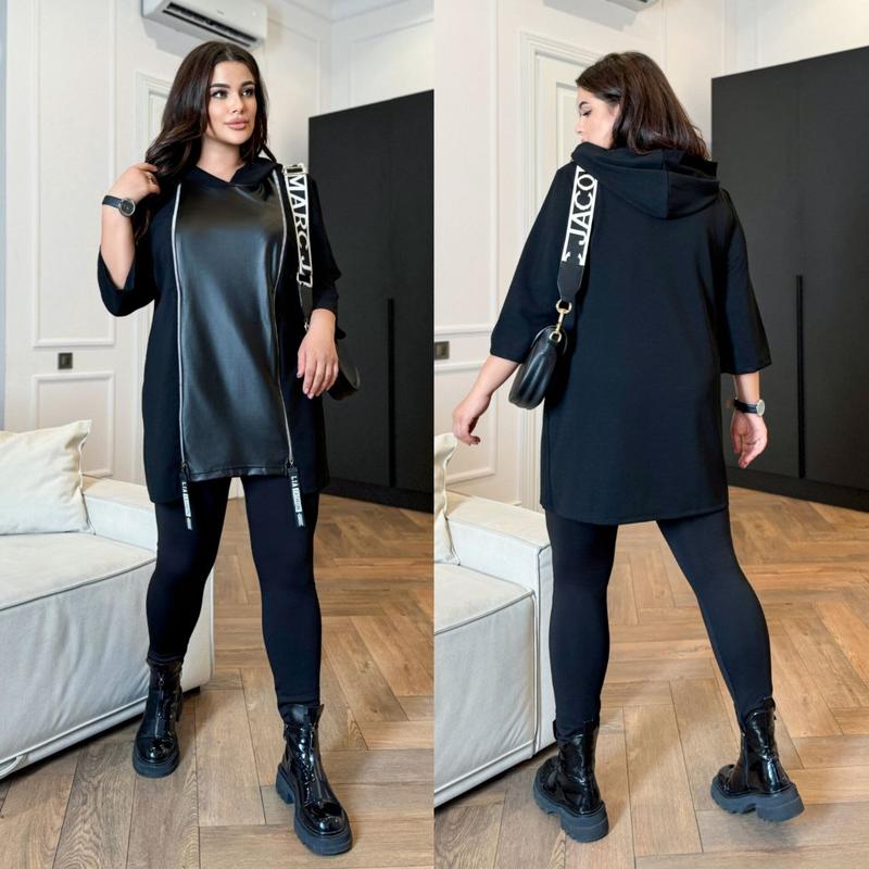 🤔Туніка🔥 Модель: 162 Размер: 48-52, 54-58, 60-64 📎Цена: 999 грн 🌟Ткань: крепдайвинг+ экокожа 💌Цвет: черный Стильная туника интересного кроя с капюшоном, украшена рабочими молниями. Спинка удлиненная, ткань тянется. Отлично сочетается с лосинами, брюками, джинсами. ✅Замеры👇: 48-52 Обхват груди 110 см Обхват стегон 120 см Длина рукава 43 см Длина изделия 80 см 54-58 Обхват груди 120 см Обхват стегон 128 см Длина рукава 47 см Длина изделия 81 см 60-64 Обхват груди 130 см Обхват стегон 140 см Длина рукава 46 см Длина изделия 83 см оксамит