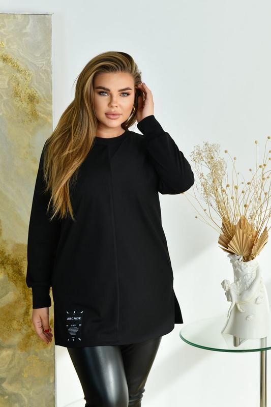 Туніка Код 3680 Ткань: трикотаж-рубчик с начесом. Шерсть 75% Вискоза 15% Эластан 10%. Цвета: черный, графит, мокко, минт, слива Размеры: 52-54, 56-58, 60-62, 64-66. Длина туники: 79, 80, 81, 82 см. Длина рукава: 61, 61, 62, 62 см. Обхват рукава: 40, 42, 44, 46 см. Замеры готового изделия: 52-54 ОГ 118 ОТ 116 ОС 120 56-58 ОГ 126 ОТ 124 ОС 128 60-62 ОГ 134 ОТ 132 ОС 136 64-66 ОГ 142 ОТ 140 ОС 144 Стильная повседневная туника из качественного трикотажа-рубчик с начесом ( растяжимость средняя). Туника прямого силуэта, по фигуре должна быть свободной, такая модель. Рукав на манжеті. Вырез горловины круглый. Туника декорирована стильной нашивкой. По бокам небольшие разрезы. Карман, застежек нет.