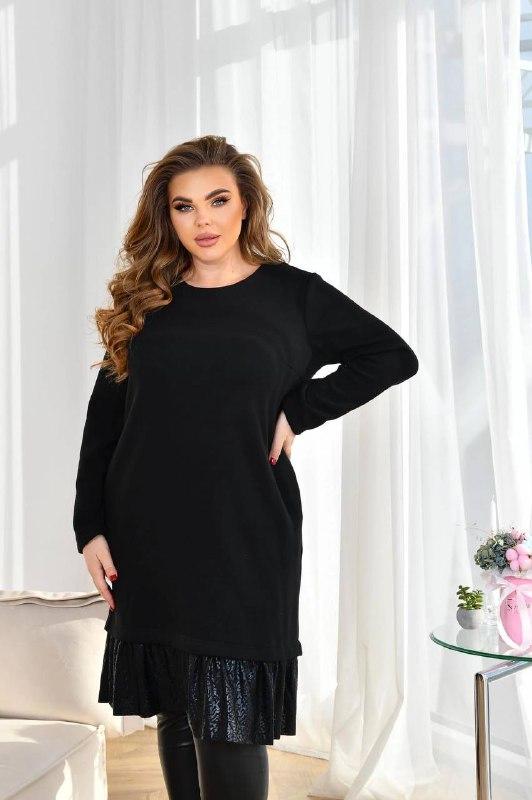 Размеры 50/52, 54/56, 58/60 Ткань ангора вязка , отделка эко кожа Ткань очень теплая , мягка, приятная к телу ,имеет растяжимость 3-5 см Цвет черный В боковых швах карманы Платье свободного кроя Замеры Р 50/52 ОГ-104-108, ОБ -108-114 ДИ-101 54/56 ОГ-108-114, ОБ-114-120 ДИ-103 58/60 ОГ-114-118, ОБ-120-124 ДИ -104 эль